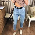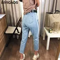 BIVIGAOS 2019 New Women Elastic Waist Triangle Buckle Boyfriend Jeans Loose Denim Harem Pants Korean Cropped Jeans Spring Autumn